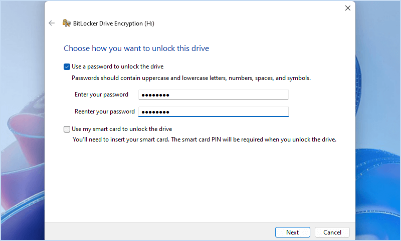 步骤 2:勾选“使用密码解锁驱动器”复选框,然后输入两次所需的密码。然后点击下一个。