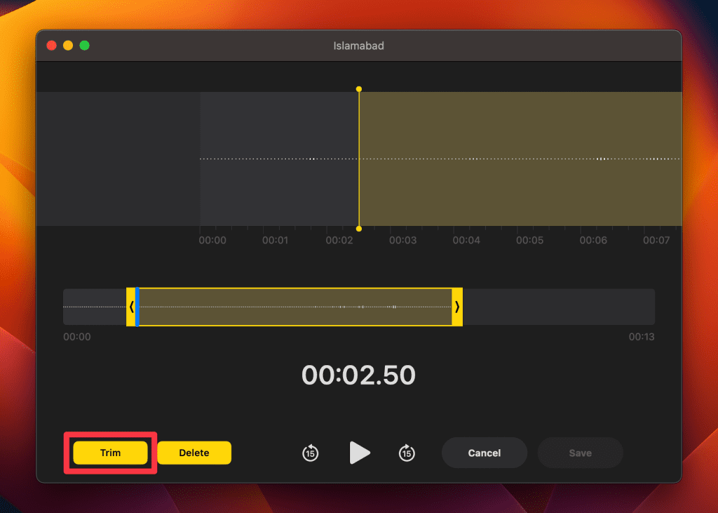 - 如果要编辑录音,可以通过拖动波形开头或结尾的黄色手柄来修剪音频。然后,点击修剪。