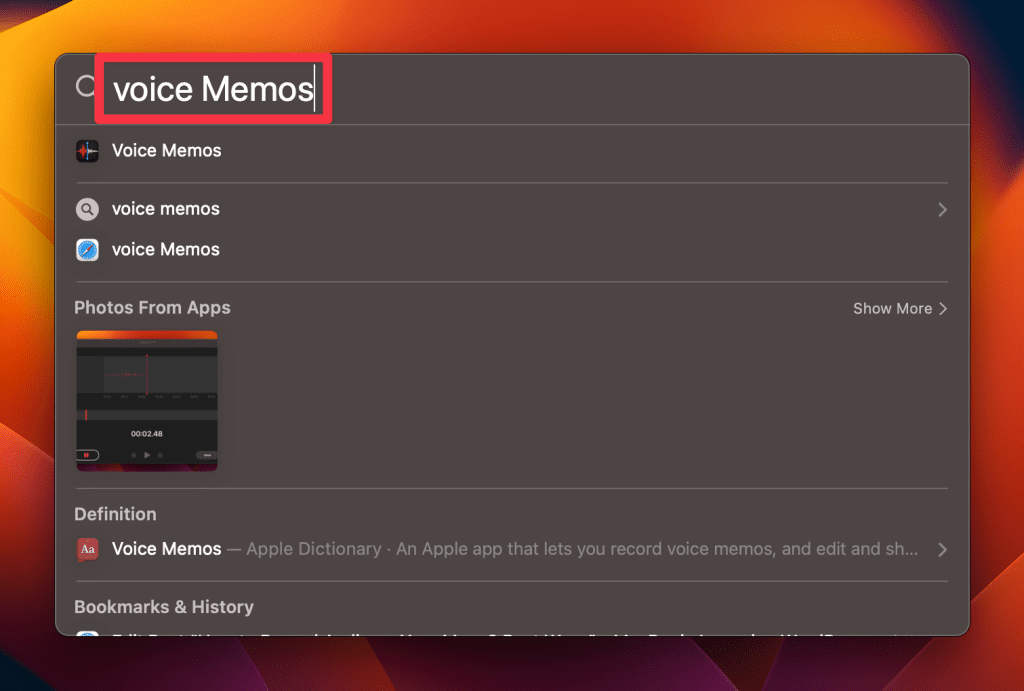 - 使用 Spotlight 搜索 (命令 ⌘ + 空格键)找到并打开语音备忘录应用程序。