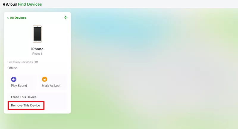 步骤2:登录“查找设备”后,选择卡在激活锁上的iPhone并单击“删除此设备”,然后按照屏幕提示确认删除。