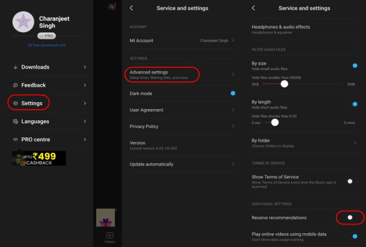 - 要禁用 MIUI 音乐应用程序中的广告:打开应用程序 > 点击左上角的菜单图标 > 设置 > 高级设置。