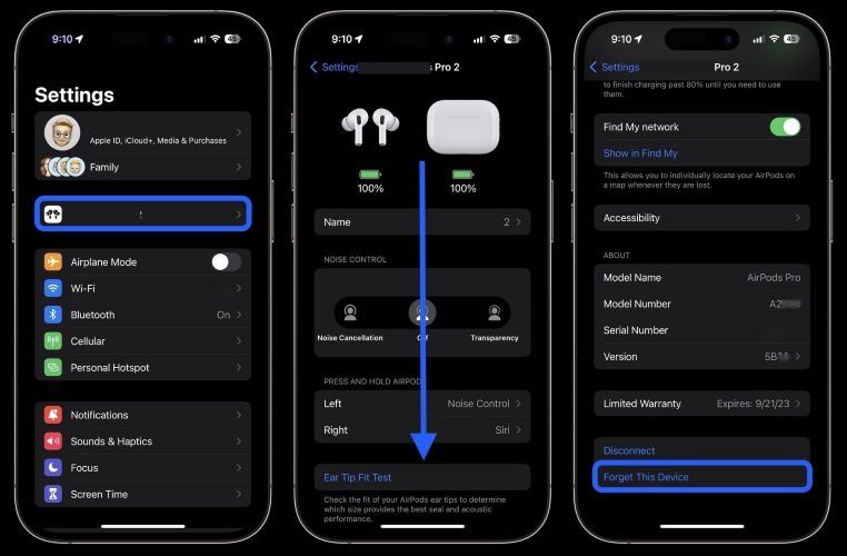 步骤1。前往设置在 iPhone 上,点按您姓名正下方显示的 AirPods 横幅。向下滚动并选择忘记此设备。