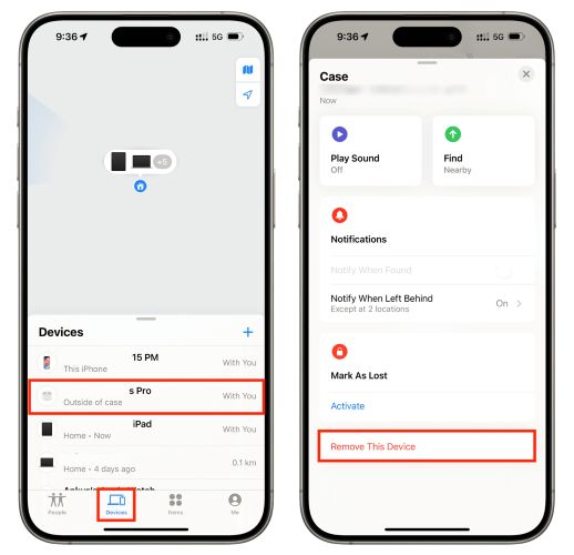 从这里开始,您的 AirPods 将不再显示在任何其他设备上。如果您想重新连接,则需要再次将它们配对,并且其他任何人现在都可以将它们添加到自己的“查找我的”网络中。