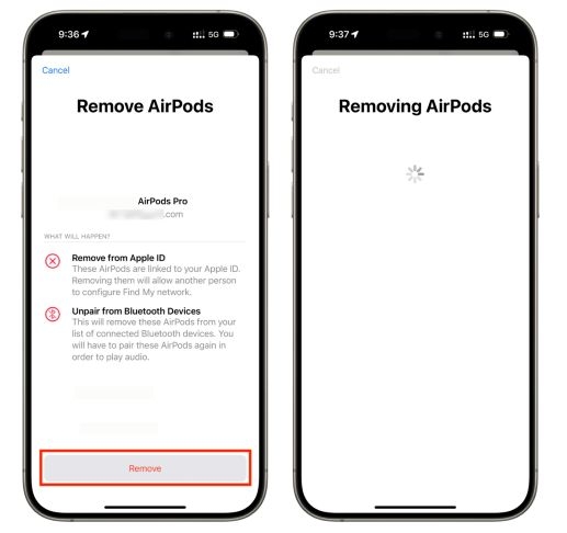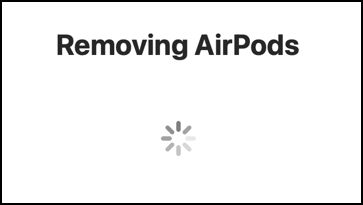 步骤 4。屏幕将短暂切换到“正在移除 AirPods”加载状态。在测试中,这部分需要长达两分钟的时间。要有耐心,让这个过程完全完成。