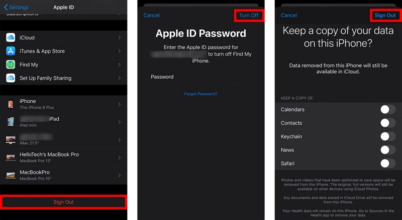 步骤3:现在,返回 Apple ID 页面并滚动到页面底部。然后,选择“退出”并输入您的“Apple ID 密码”确认操作。