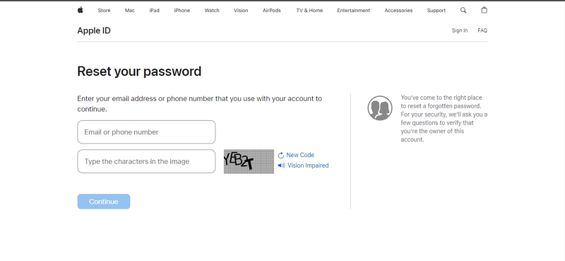 步骤2:输入您的“Apple ID 地址”以及所提供图像中的相关字符。然后,单击“继续”。