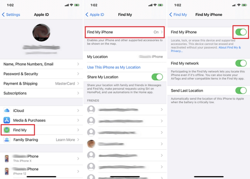步骤3:现在,找到“查找我的 iPhone”选项并点击它。然后,将其关闭以禁用 iPhone 上的 Apple ID。之后,您可以将 iPhone 恢复出厂设置,以完全删除无需密码的 Apple ID。