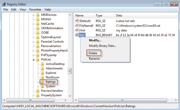 单击评级文件夹。在右侧窗格中,右键单击钥匙然后单击删除。点击是的在弹出的对话框中删除该密钥。这将从您的 Internet Explorer 中删除内容审查程序密码。