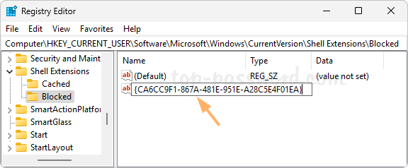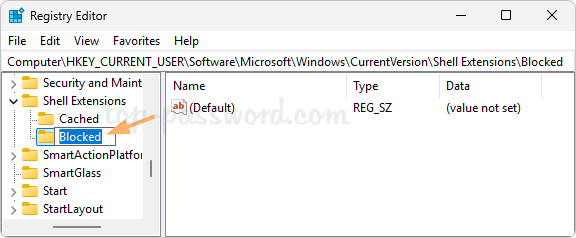 - 突出显示“被阻止”键,然后转到右侧窗格,右键单击任意空白区域并选择新的->字符串值。