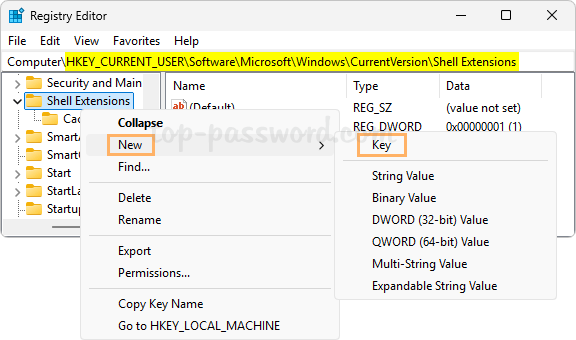 HKEY_CURRENT_USER\Software\Microsoft\Windows\CurrentVersion\Shell Extensions。右键单击“外壳扩展” 键并选择新的->钥匙。