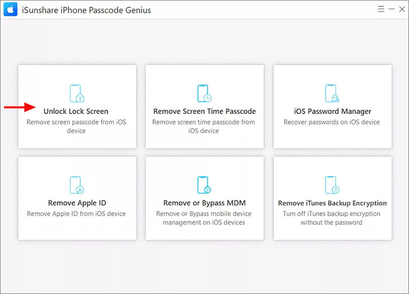 步骤1:Open Isunshare iPhone密码天才并选择解锁锁定屏幕主界面上的模式。之后,连接您的iPhone,然后单击开始>下一个按钮要处理。