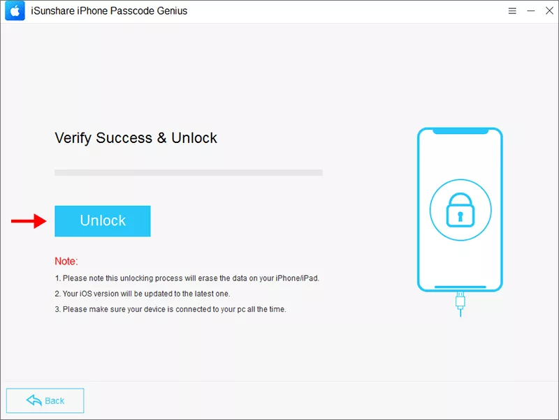 步骤3:软件包已成功验证。然后单击开锁按钮以删除iPhone上的屏幕锁。