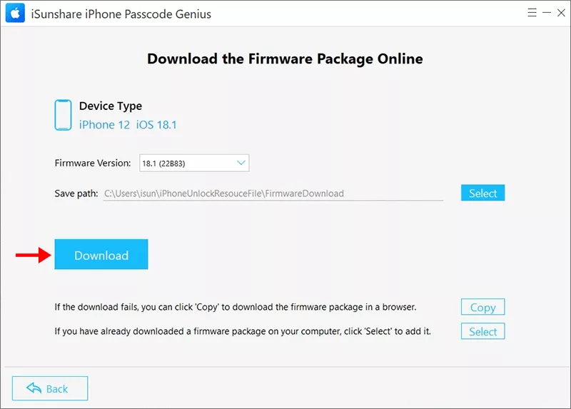 步骤2:您的iPhone已被软件成功识别。现在您可以击中下载按钮获取固件包。