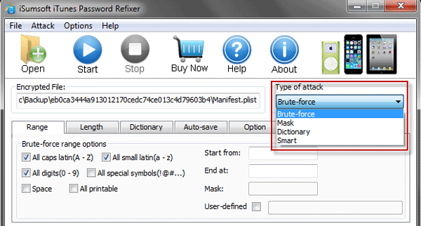 步骤 3:单击下拉按钮选择一种攻击类型。在每个攻击选项中,您可以根据您能记住的密码信息的多少来定义具体的项目。