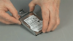步骤 4。排列新硬盘带安装支架并将其拧到位。