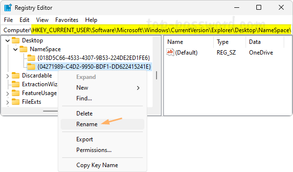 - 要删除第二个 OneDrive 条目,请打开注册表编辑器,将以下路径复制粘贴到地址栏中,然后按 Enter。在左侧窗格中,右键单击{04271989-C4D2-9950-BDF1-DD622415241E}键并选择重命名从弹出菜单中。