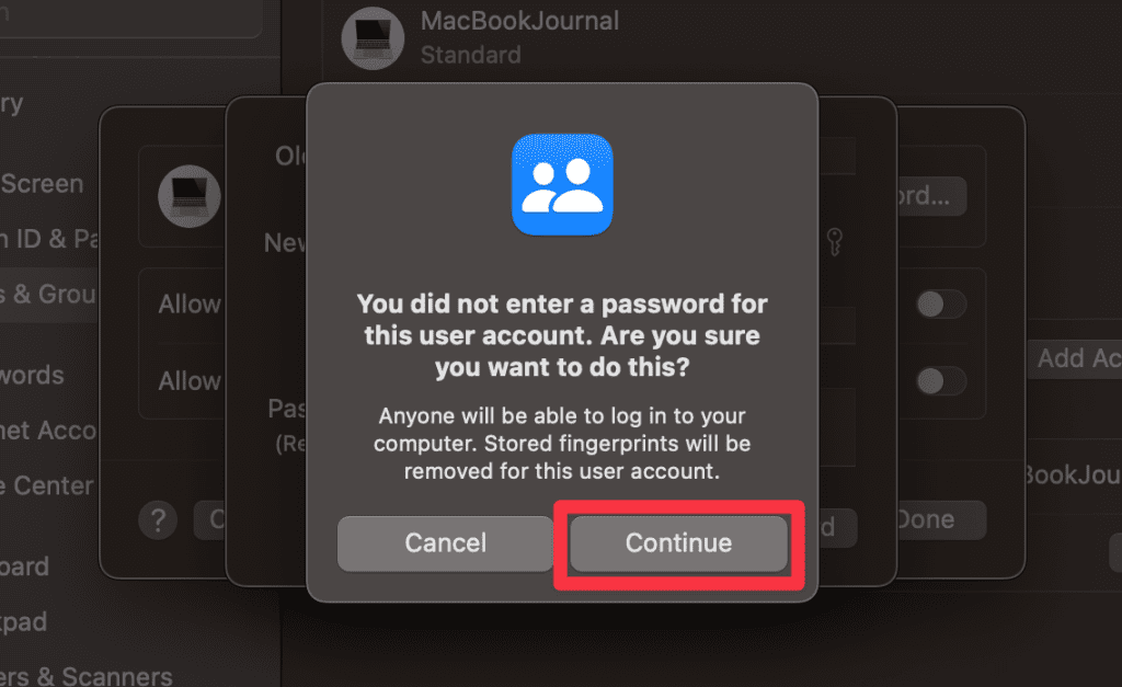 - 将出现一个警告对话框,通知您用户帐户的密码将被删除。点击继续继续。