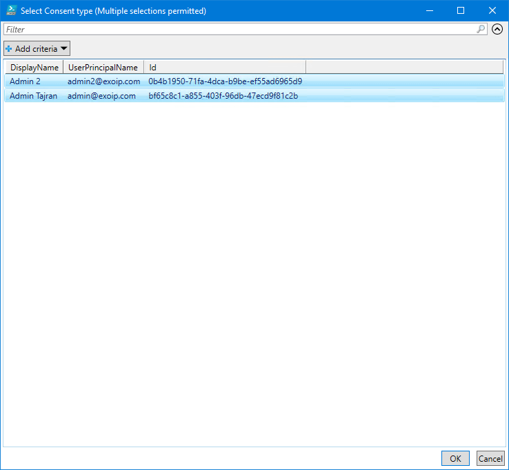 $selectUsers = $usernames | Select-Object Displayname, UserPrincipalName, Id | Sort-Object Displayname | Out-GridView -PassThru -Title "Select Consent type (Multiple selections permitted)"