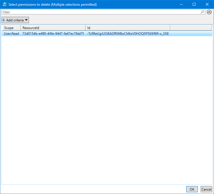 $removes = $infoScopes | Select-Object Scope, ResourceId, Id | Out-GridView -PassThru -Title "Select permissions to delete (Multiple selections permitted)"