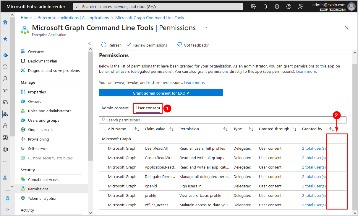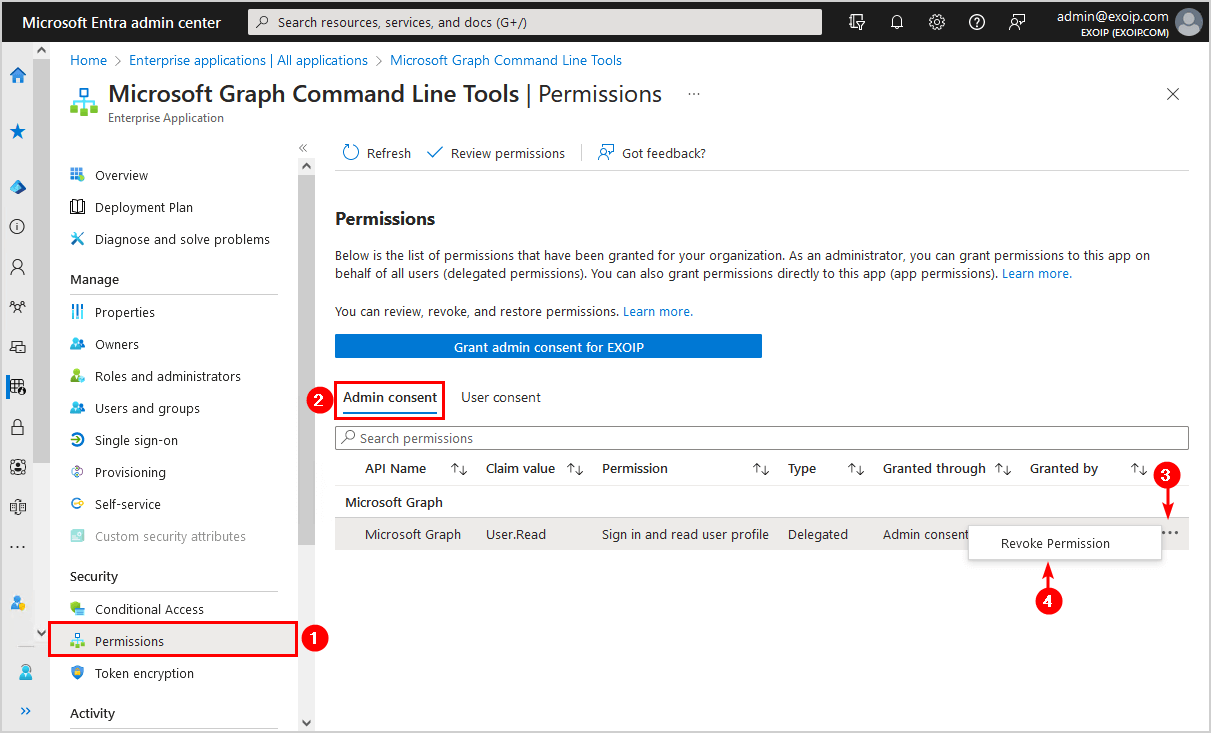 因此,当通过管理员同意授予应用程序权限时,我们可以撤销应用程序的权限。不幸的是,当通过 Microsoft Entra 管理中心的用户同意授予权限时,无法撤销权限。