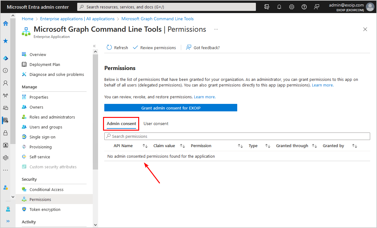 转到应用程序权限并确认管理员同意权限和用户同意权限已被撤销。
