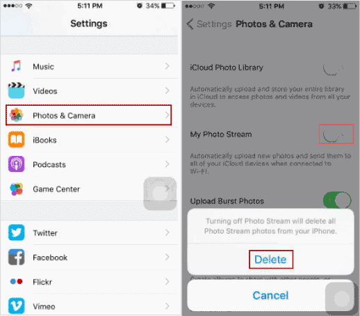 第 3 步:关闭我的照片流选项。然后点击删除。