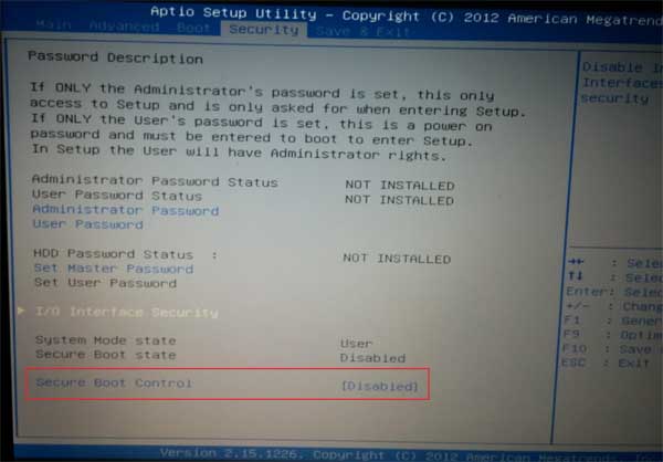 - 在安全菜单,使用键盘上的箭头键选择安全启动控制选项。按Enter设置它禁用。