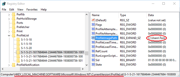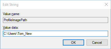 - 在右窗格中,双击 ProfileImagePath 值并将用户配置文件路径更改为您所需的名称。在我的示例中,我将帐户文件夹从 C:\Users\Tom 重命名为 C:\Users\Tom_New。