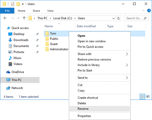 - 打开 Windows 资源管理器并浏览到 C:\Users 文件夹。右键单击您的用户帐户文件夹并将其重命名为您喜欢的任何名称。