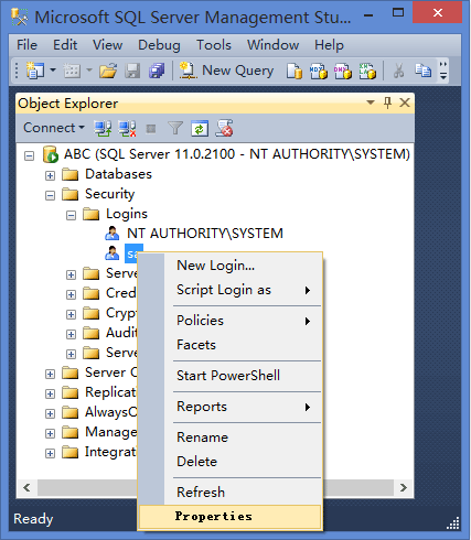 - 连接后,在“对象资源管理器”视图中,单击“安全”旁边的加号,然后单击“登录”旁边的加号。展开后,右键单击 SA 用户,然后选择属性。然后,您可以使用新密码更改忘记的 SA 密码。