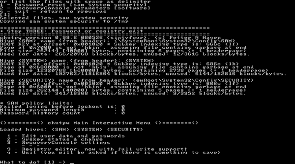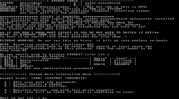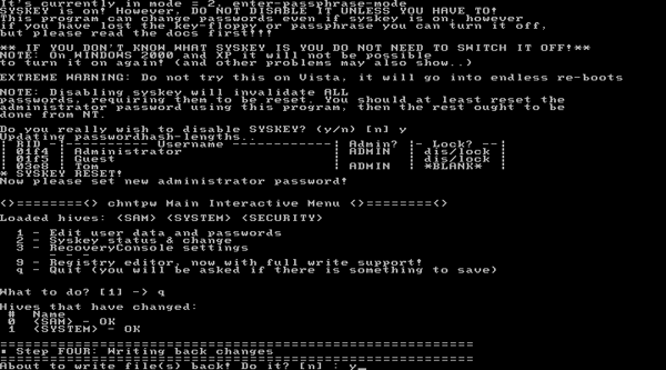 正如您所看到的,使用离线 NT 密码和注册表编辑器,您可以在几分钟内重置忘记的 syskey 启动密码。然而,该实用程序也可以轻松破坏 Windows 系统的数据。因此,该工具只能作为最后的手段使用。