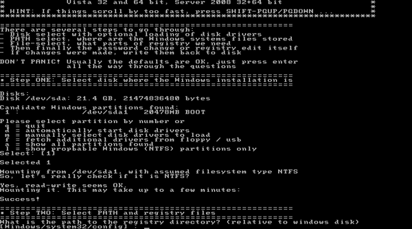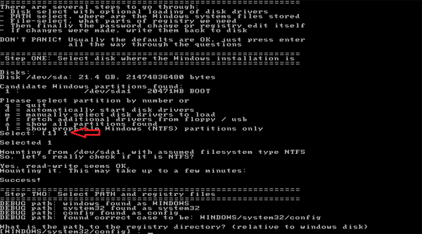 - 选择系统分区后,该实用程序会提示您指定要编辑的注册表目录。默认值就可以,所以按 Enter 键。