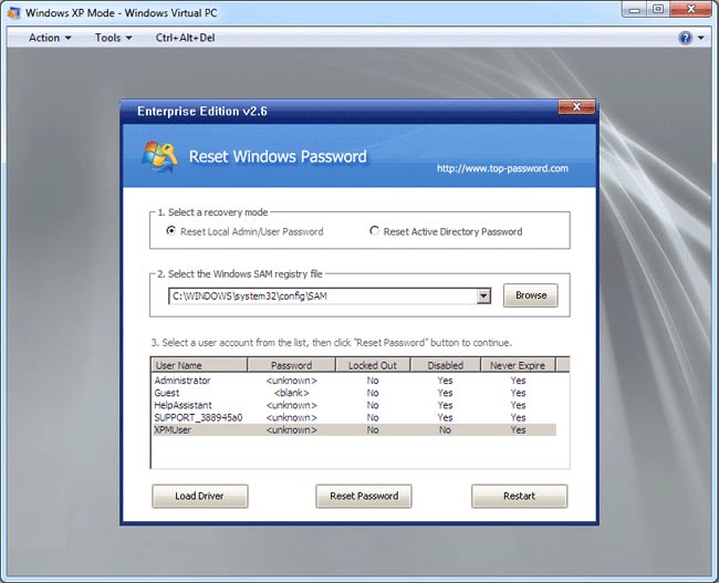 步骤#4:选择 XPMUser 帐户,然后单击“重置密码”按钮。它将立即解锁/重置您忘记的 Windows XP 模式密码。