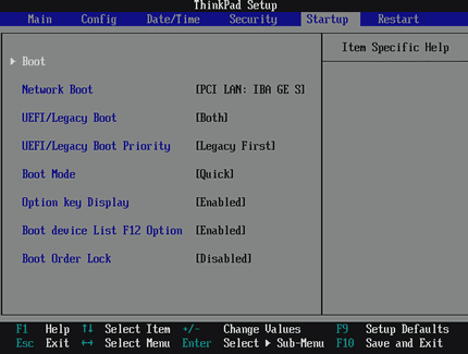 现在将可启动 CD/CD 或 USB 驱动器插入锁定的 ThinkPad 笔记本电脑。启动机器并进入BIOS。导航至启动选项卡。改变UEFI/传统启动选项从 UEFI 为 Both,然后设置UEFI/传统启动优先级选项传统优先。按 F10 保存更改。