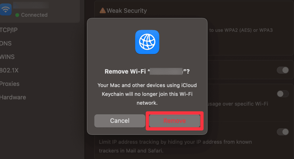 - 可能会出现一条提示,询问您是否确定要删除 Wi-Fi 服务。单击确认您的选择消除。