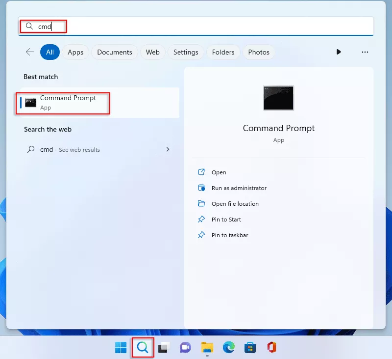 第5步:单击搜索图标,然后在搜索框中输入“cmd”并