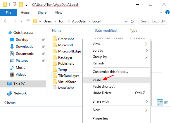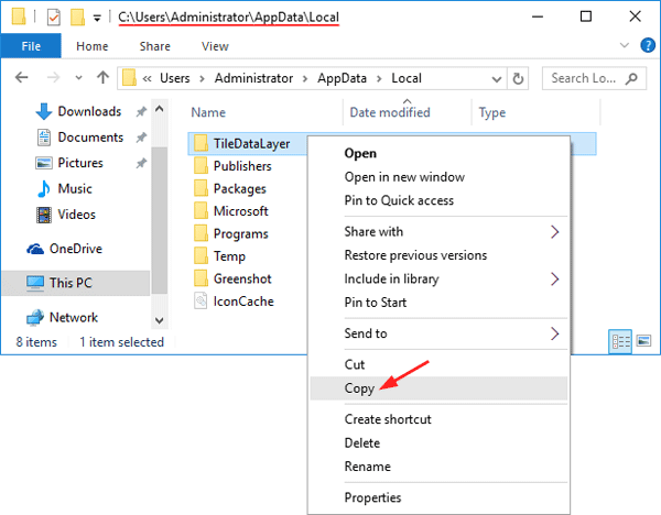 注销您的常规帐户,然后使用新的管理员帐户登录。复制备份文件夹 C:\TileDataLayer 并将其粘贴到该目录中C:\Users\{regular_account}\AppData\Local。当提示替换文件或跳过复制时,单击“替换目标中的文件”。