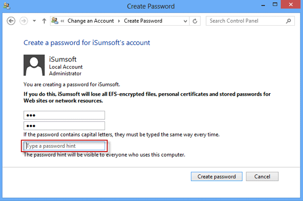1. 在 Surface 上为 Windows 8.1 帐户创建密码时创建密码提示。一旦忘记密码,密码提示会提醒您密码。