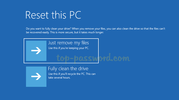 接下来,您将获得另外两个选项:“只需删除我的文件“ 和 ”彻底清洁驱动器“。如果您保留这台计算机,请选择前一个选项,速度更快。如果您要回收计算机,请选择后一个选项,以擦除驱动器并使您的文件完全无法恢复。
