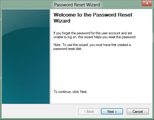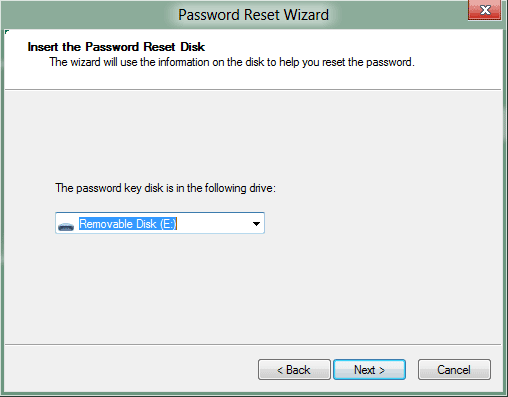 - 单击“重置密码”链接后,将出现“密码重置向导”对话框。此时,请确保在单击“下一步”之前插入 Windows 8 密码重置磁盘。