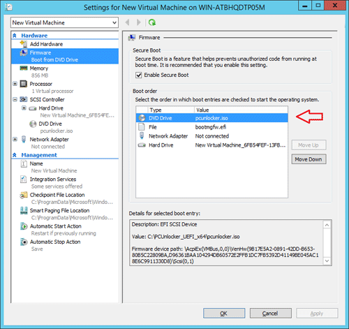 PCUnlocker 可以从 UEFI 可启动 CD 或 USB 闪存驱动器运行。但是,Hyper-V Gen2 VM不提供从USB驱动器启动的方式,并且虚拟DVD驱动器仅支持ISO映像文件。因此,这里我们将使用 PCUnlocker 的 ISO 映像来启动 Gen2 VM,然后执行密码重置。
