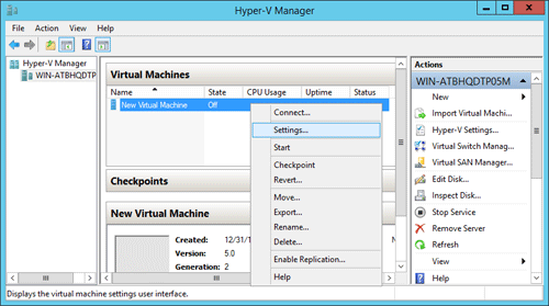 - 启动 Hyper-V 管理器。右键单击要为其重置丢失密码的 Windows Server 2012 虚拟机,然后选择设置…从下拉菜单中。