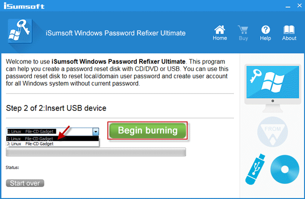 1. 在任何可以访问 Internet 的可用计算机上,打开浏览器。下载并安装iSoft Windows 密码修复器软件。运行这个软件。选择一种媒体类型(USB 设备或 CD/DVD)。然后将可移动设备连接到可用的计算机。