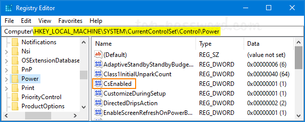 HKEY_LOCAL_MACHINE\SYSTEM\CurrentControlSet\Control\Power。在右侧窗格中,双击 DWORDCs启用来修改它。