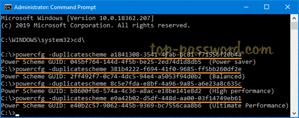 powercfg -duplicatescheme e9a42b02-d5df-448d-aa00-03f14749eb61