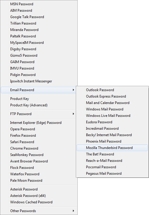 - 将光标移至电子邮件密码选项,您可以看到程序可以从中检索保存的电子邮件密码的电子邮件客户端列表。