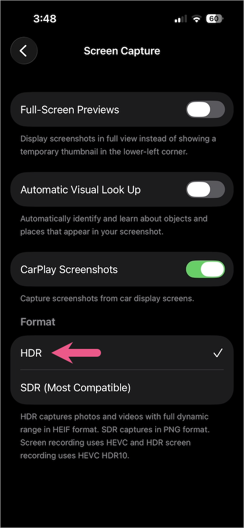为此,请转至设置 > 常规 > 屏幕捕获并选择高动态范围格式。屏幕录制现在将以 HDR 格式捕获(使用 HEVC HDR10)以供支持的应用程序和播放。