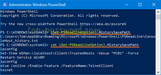 - 接下来,键入以下命令以显示保存 PowerShell 命令历史记录的文件的路径。