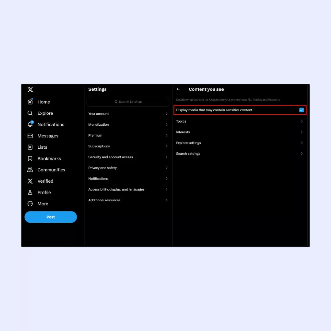 成功完成这些步骤后,您将立即能够看到包含敏感内容的推文。然而,这些推文通常不会被搜索到。如果您希望允许 NSFW 材料,请按照以下步骤操作: