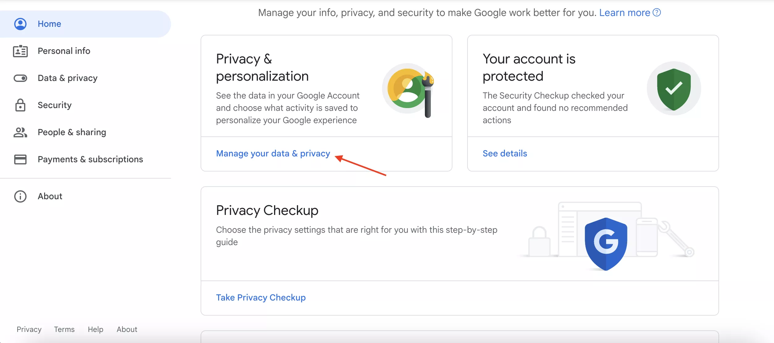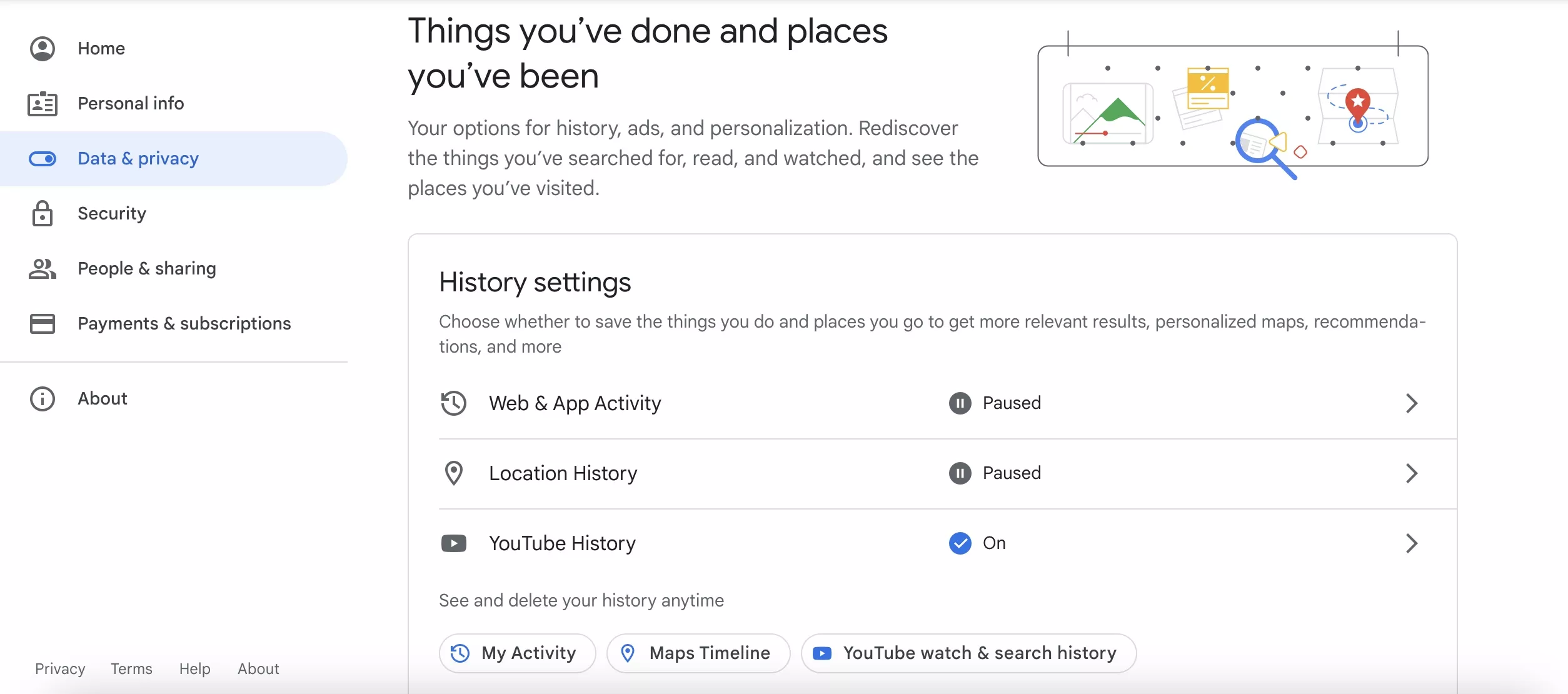 简单的!登录您的谷歌帐户, 前往数据和隐私,并查看他们掌握的有关您的信息。这就像查看您自己的数字档案一样!